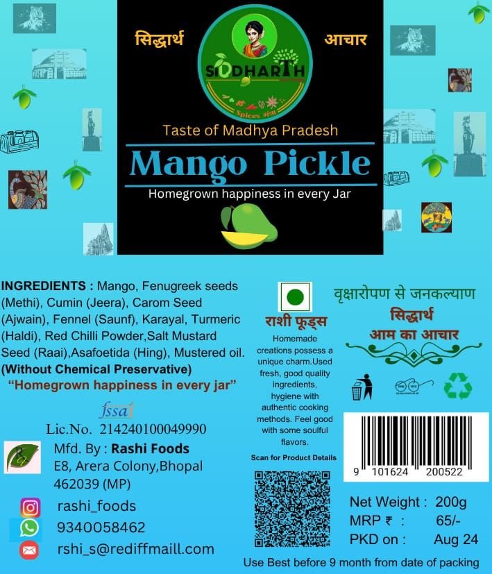 Mango, Fenugreek seeds (Methi), Cumin (Jeera), Carom Seed (Ajwain), Fennel (Saunf), Karayal, Turmeric (Haldi), Red Chilli Powder, Mustard Seed (Raai), Asafoetida (Hing), Salt